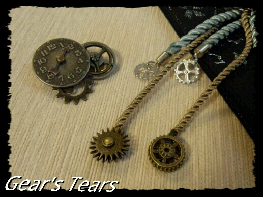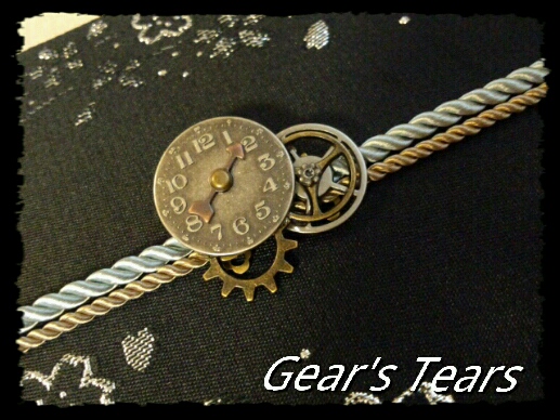 燻し銀色と銅色の紐の端に、それぞれ歯車を。